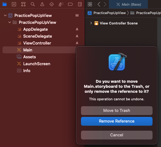 프로젝트에서 Storyboard를 제거하는 것이 목표이기 때문에 우선 Main Storyboard를 삭제해줍니다.